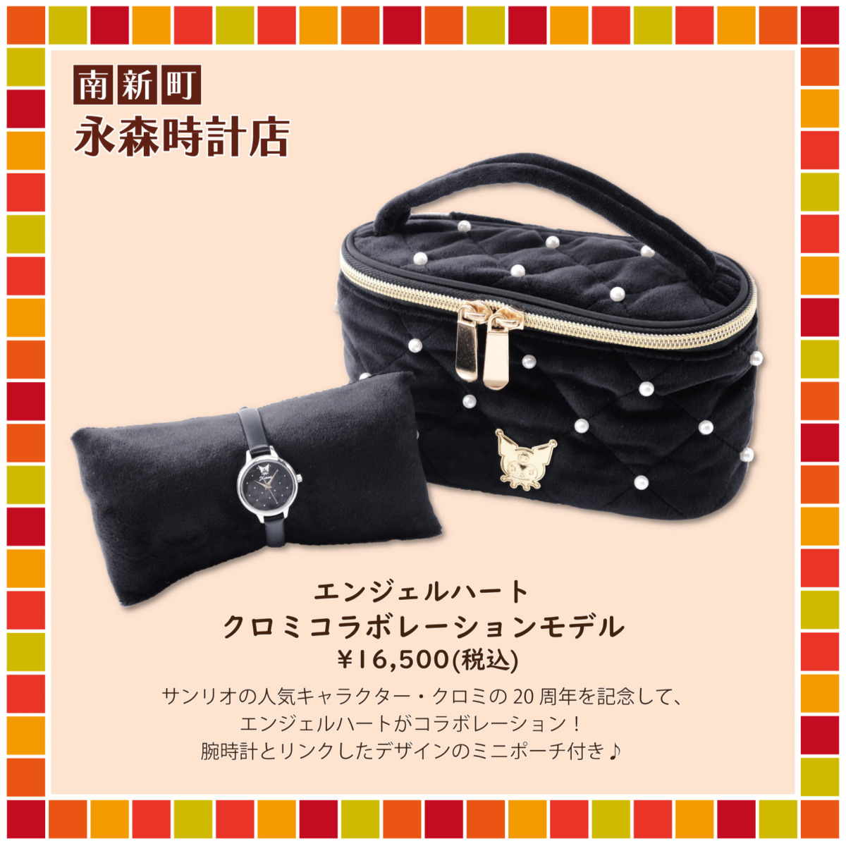クロミをイメージしたブラックのデザインで、キルティング加工の文字盤と、お顔がプリントされたガラスがキュート。腕時計とリンクしたデザインのミニポーチ付き♪
